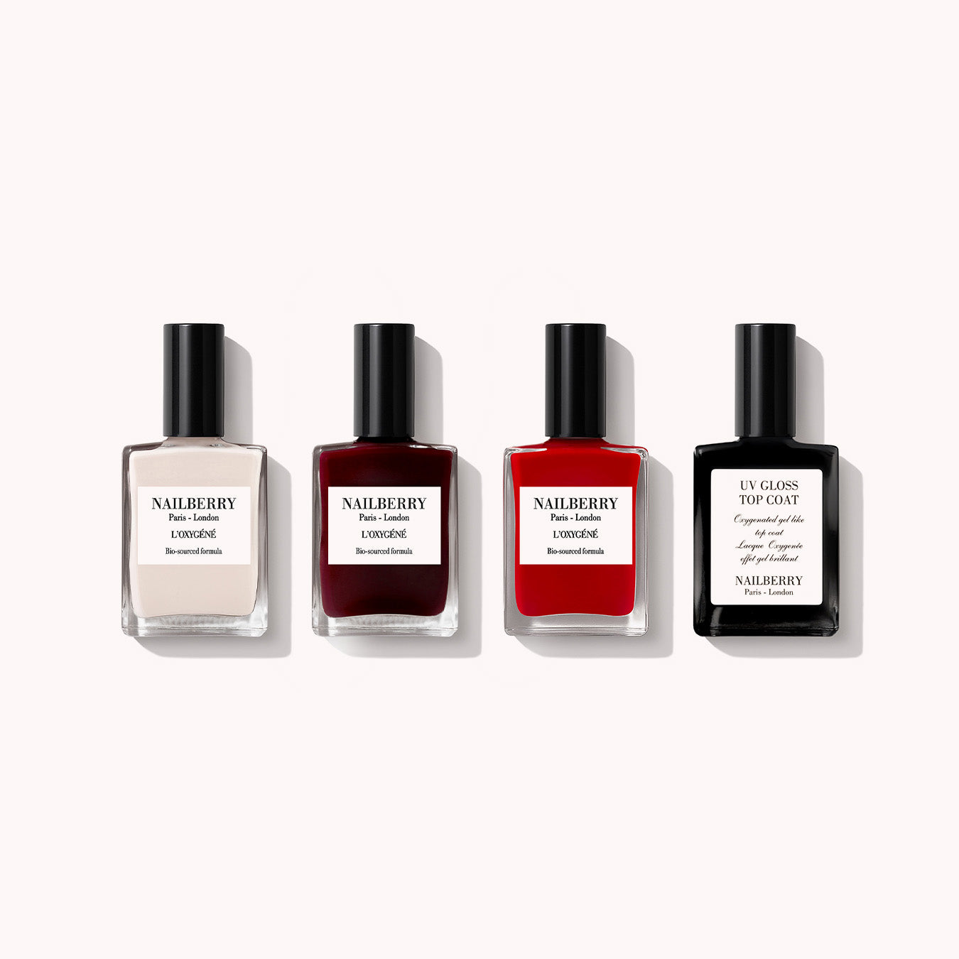 Featuring our soft, sophisticated beige-white, Almond, fabulously fiery red, Rouge, and decadent deep red-black, Noirberry, alongside our game-changing top coat, UV Gloss top coat - sealing in mirror-like shine and your longest wearing manicure.