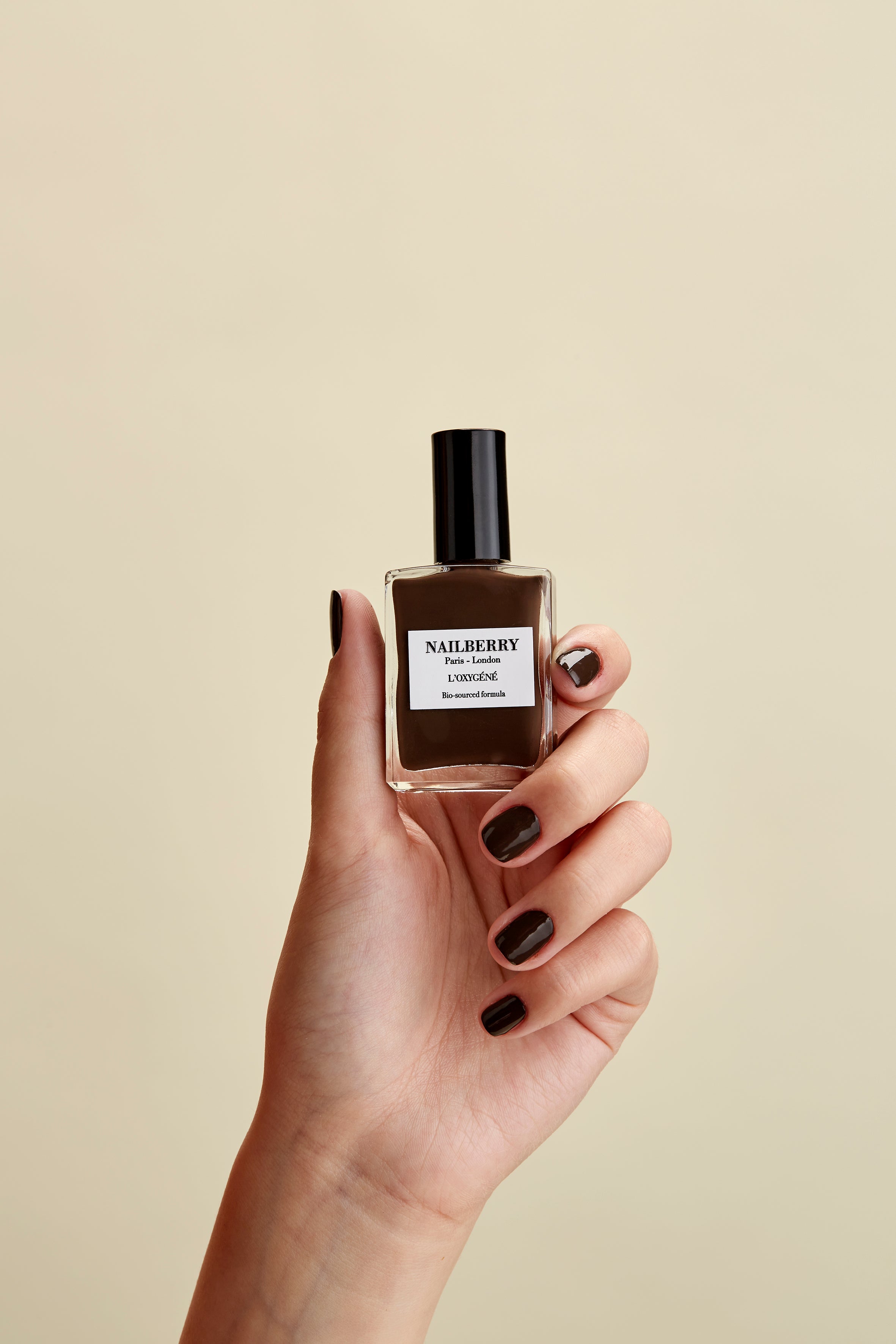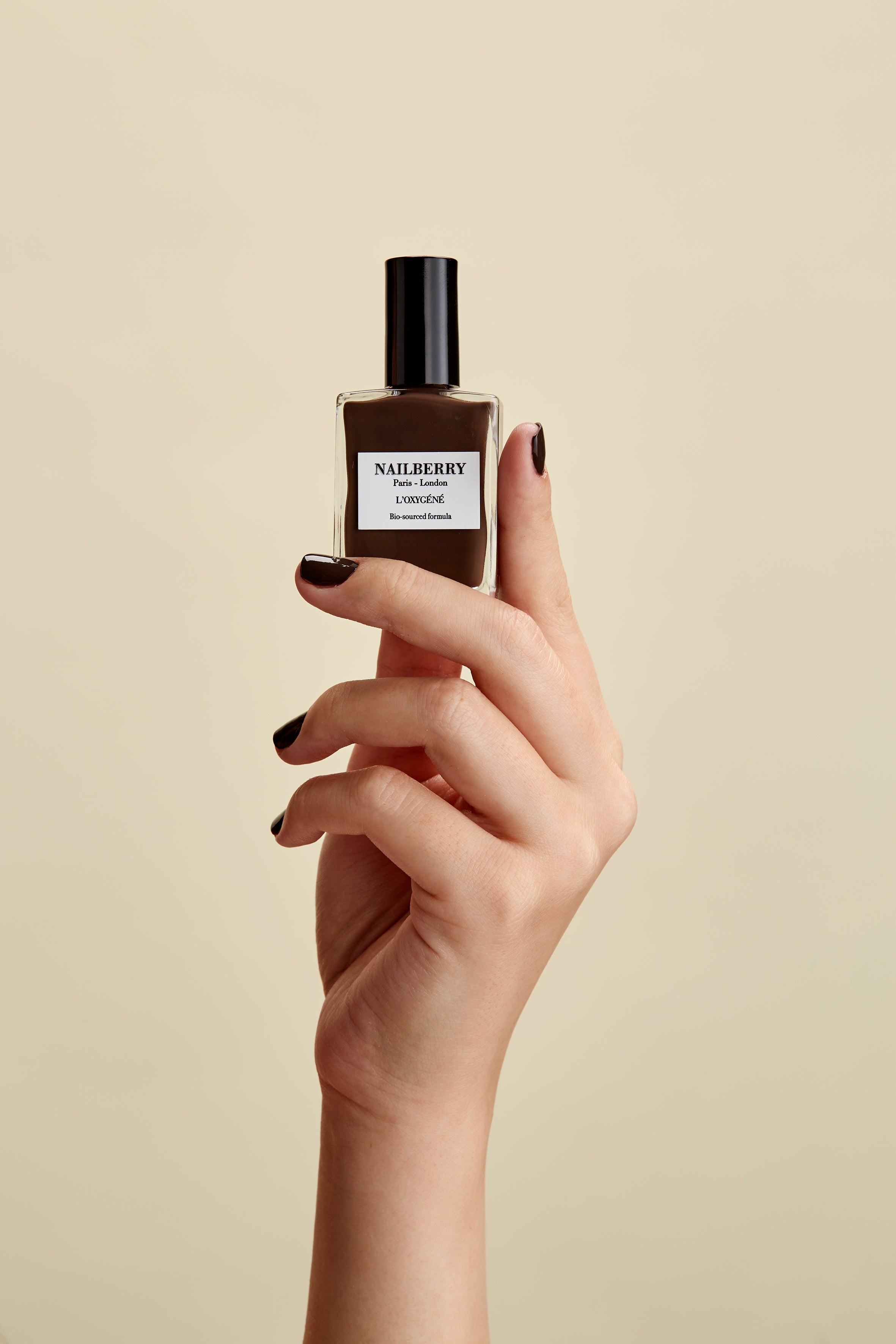 Dip brush into chosen L’Oxygéné Colour, remove excess from brush, then apply one thin layer to each nail. Allow 2-3 minutes to dry, then apply a second thin layer to each nail and allow to dry.