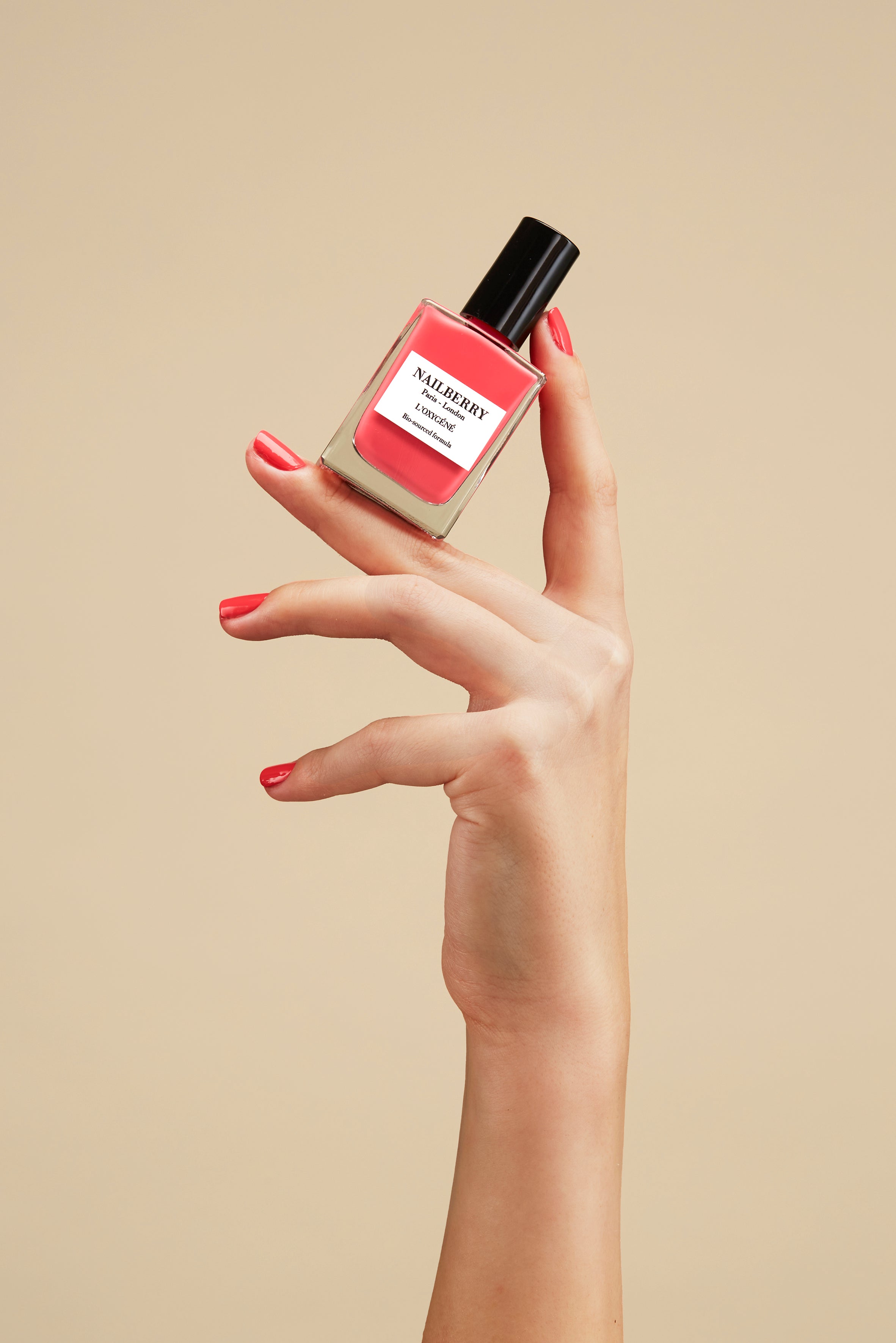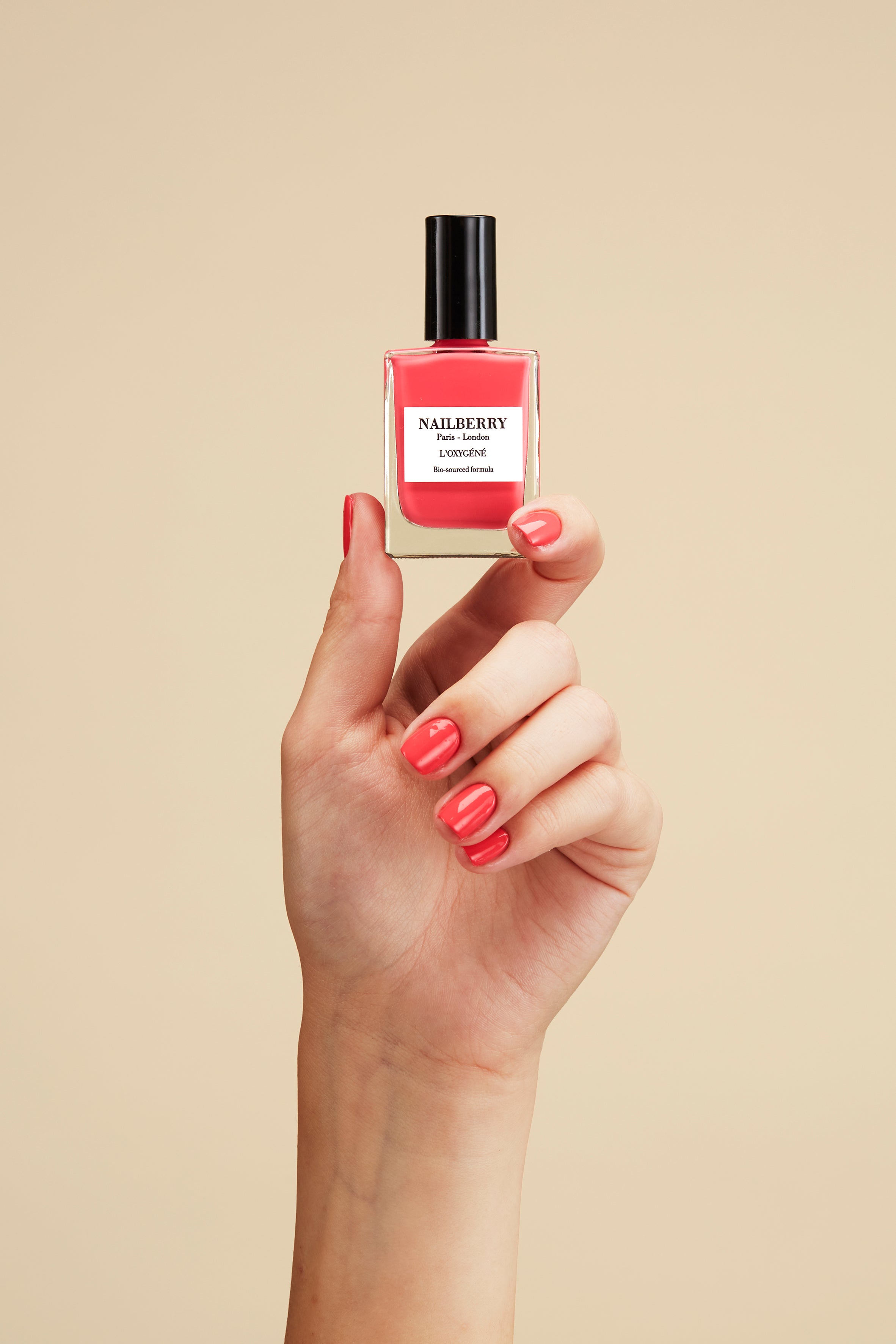 Dip brush into chosen L’Oxygéné Colour, remove excess from brush, then apply one thin layer to each nail. Allow 2-3 minutes to dry, then apply a second thin layer to each nail and allow to dry.