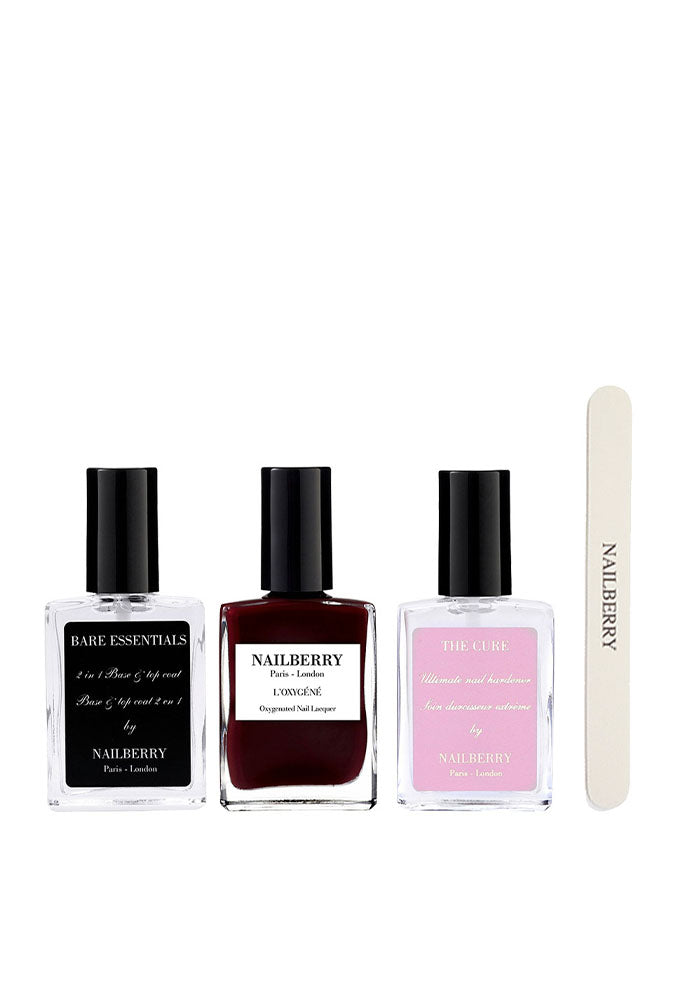 Refine and shape nails with our professional-standard cushioned file before repairing and restoring nails with our powerful dual-action treatment and oxygenated base coat, The Cure. Two layers of our intense and opulent founder-favourite, Noirberry guarantees head-turning colour and glamour while a finishing sweep of Bare Essentials locks in dazzling shine and staying power.